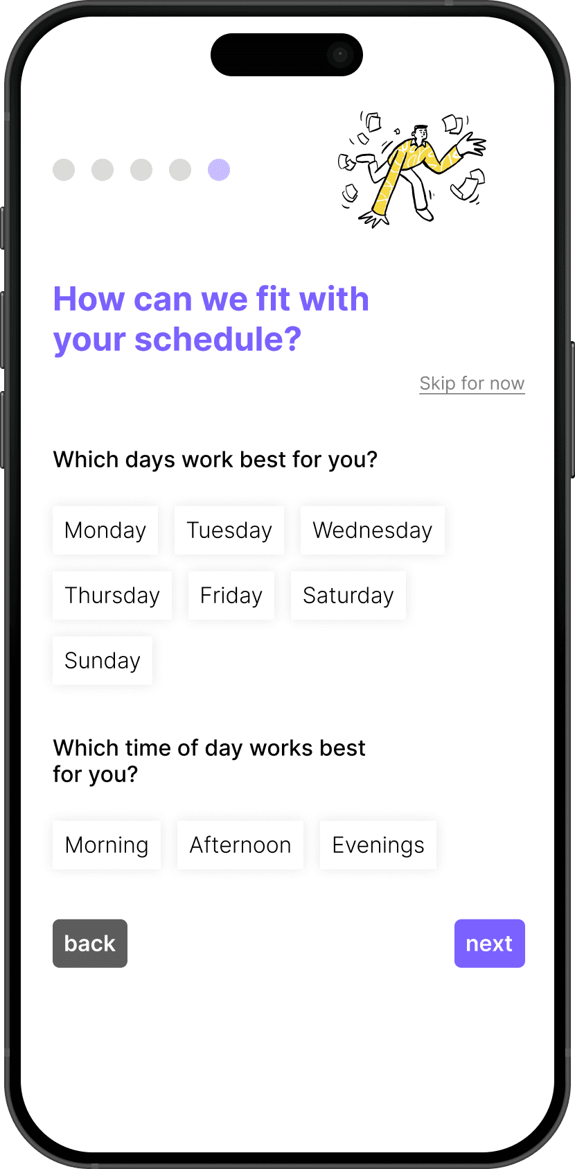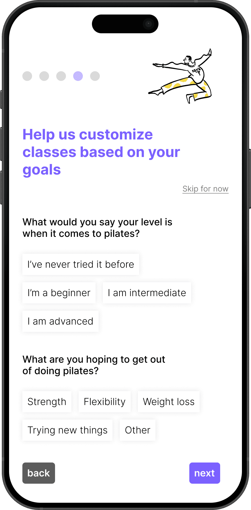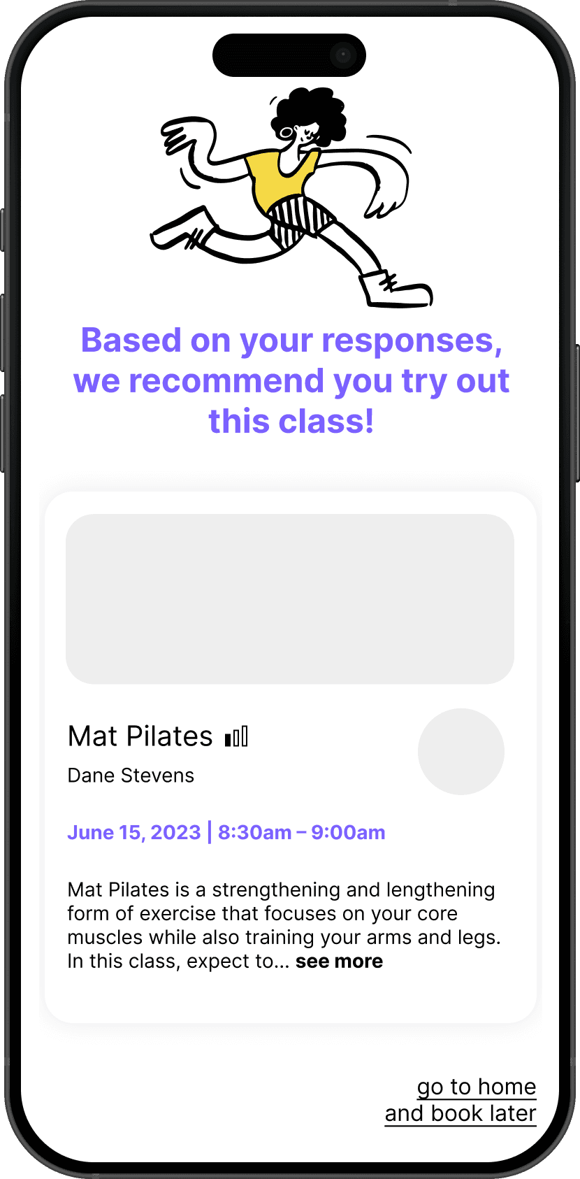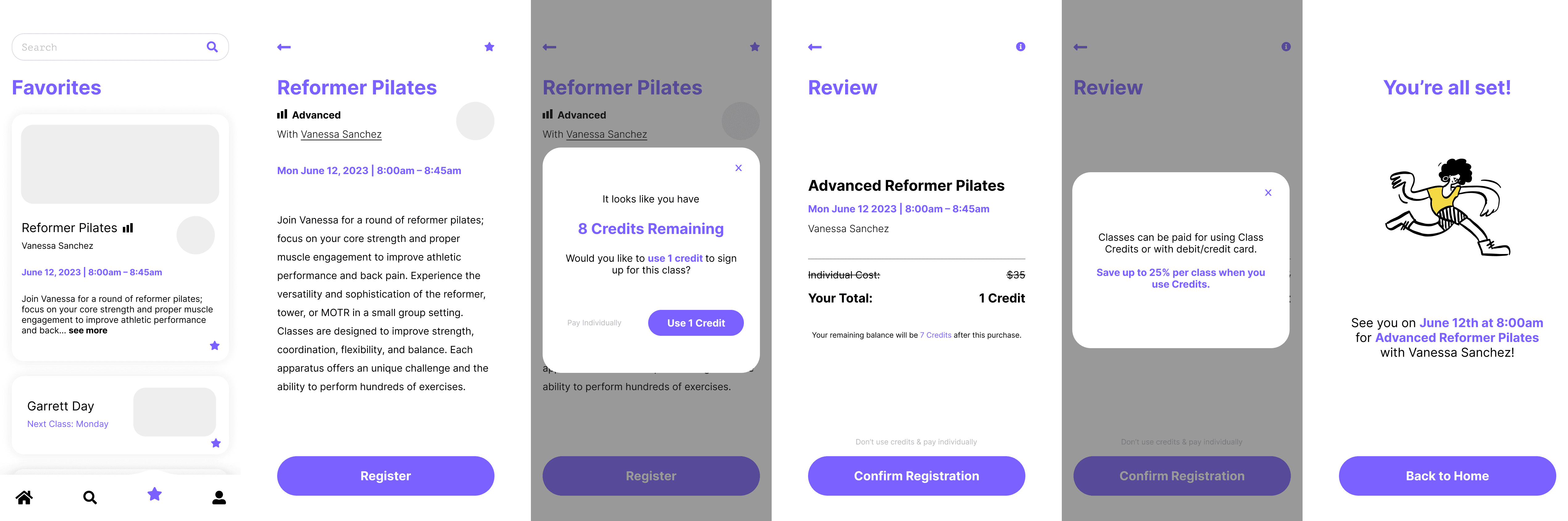 We conducted eight usability tests for two user flows: new users creating accounts, adding preferences, and reviewing recommendations; and returning users booking classes using credits through the favorites page.